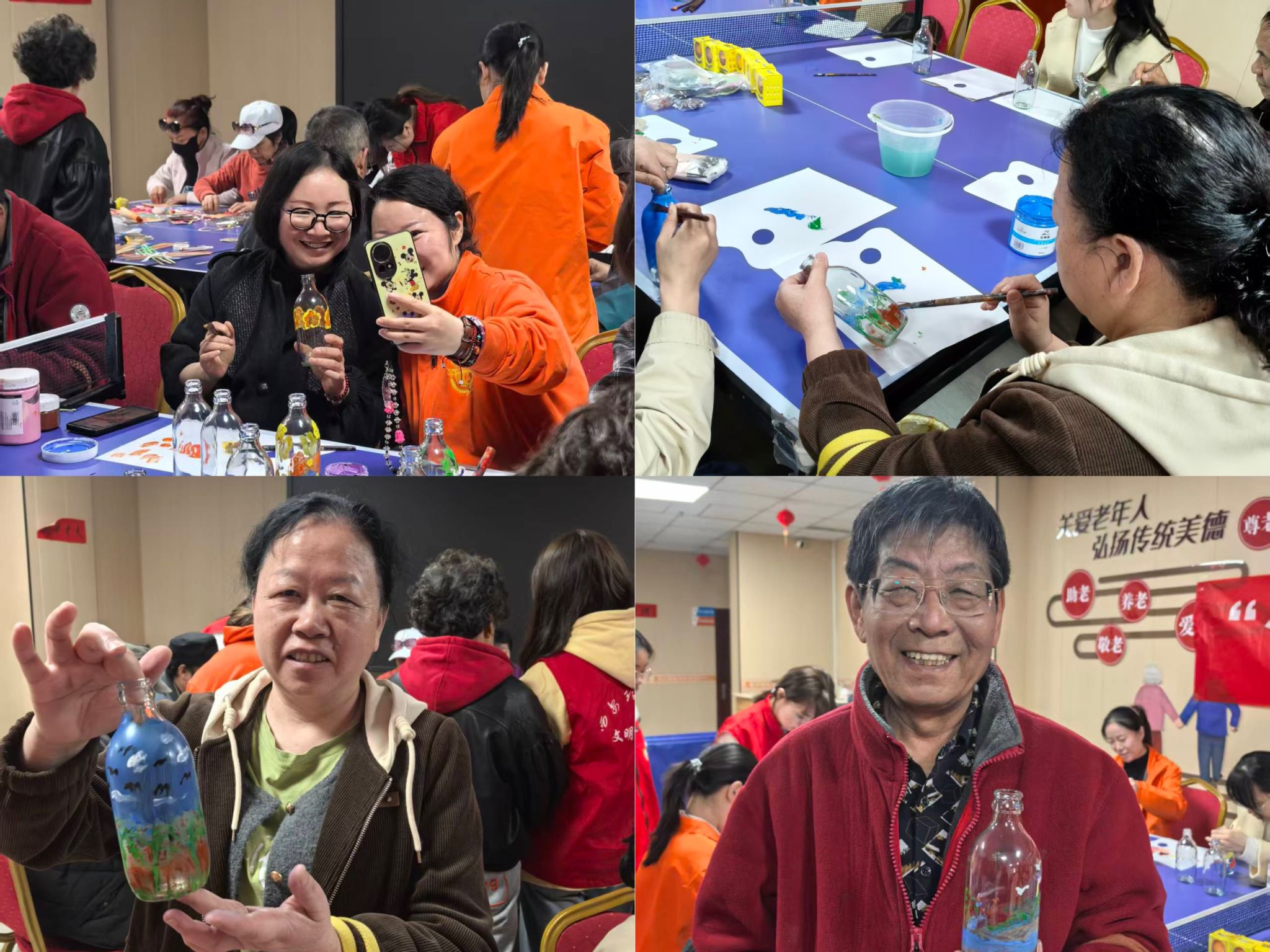 活动现场,志愿者向居民讲解了竹编技艺的历史渊源与文化内涵,并采取分步示范教学方式,从固定竹篾、编织造型到修边穿流苏,细致传授编织技巧。一根根纤细的竹篾在居民手中逐渐蜕变为兼具实用价值与艺术美感的书签、风铃,每一次编织皆是对传统技艺的致敬;与此同时,志愿者围绕生态环保主题开展了艺术彩绘玻璃瓶创作活动,在志愿者的引导下,社区居民用画笔表达情感、释放压力,绘画过程不仅激发了居民的创作热情,也发挥了艺术疗愈的积极作用,促进了邻里之间的交流与情感联结。