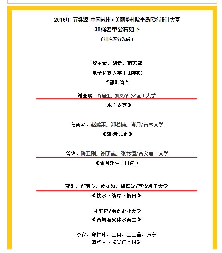 近日,我校永利集团304环艺系学生谢亚鹏、许岩生的作品《水岸农家》,学生贾果、崔雨心、黄彦如、郑福梁的作品《枕水·绕岸·栖田》,学生曾锋、陈卫刚、谢子彧、张书恒的作品《偷得浮生几日闲》,成功入围2016年“五维源”中国苏州 ▪ 美丽乡村与半岛民宿设计大赛前38强,值得庆贺。