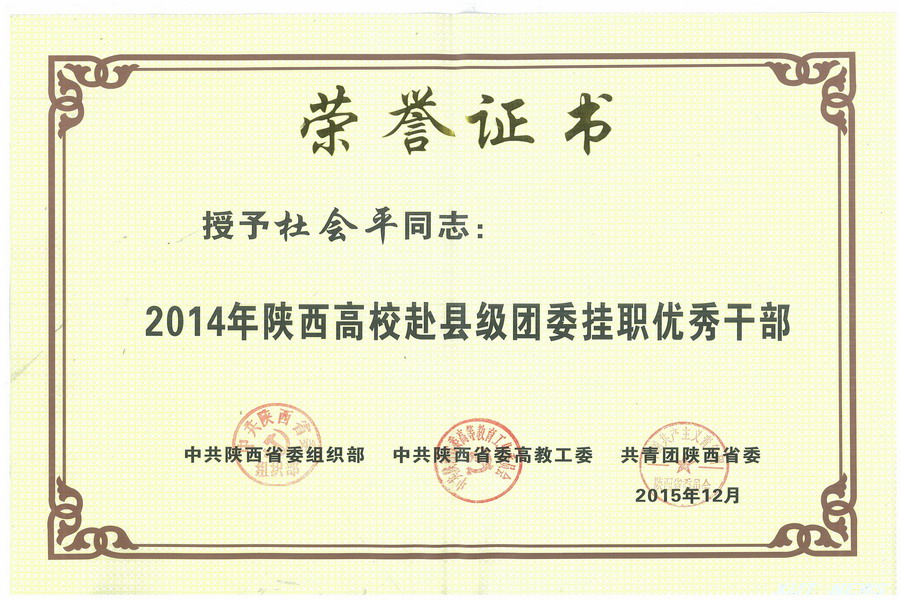 12月3日,由省委组织部、省委高教工委、团省委联合举办的2015年陕西高校团干部赴县级团委挂职出征仪式暨2014年优秀挂职干部表彰大会在西安举行。我校挂职干部杜会平同志荣获“陕西高校赴县级团委挂职优秀干部”荣誉称号。