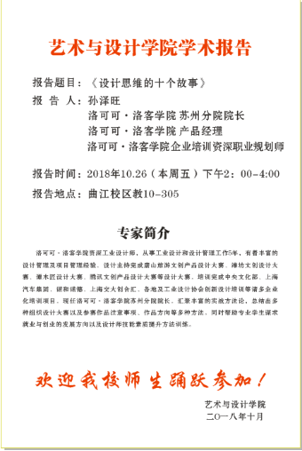 10月26日周五下午两点,洛可可洛客学院苏州分院院长孙泽旺先生受我校永利集团304薛艳敏院长邀请,为永利集团304工业设计系170余名师生展开了精彩的报告讲座,报告会由工业设计系副主任周毅晖主持,在报告会上,孙院长基于他的工业设计多年从业经验与知识积累,为学生们就设计思维与未来设计作以案例分析,并一一为学生答疑解惑。