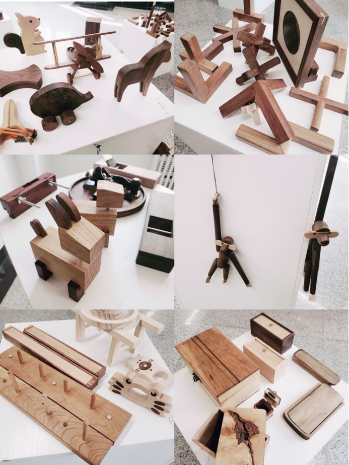 展览现场的实木作品包括:日常生活家具、儿童玩具、装饰摆件等40余件,全部在学院实验中心的FESTOOL和木工综合实验室设计加工,涉及现代木工工具中的锯、刨、磨、钻、车以及木工CNC等诸多设备。