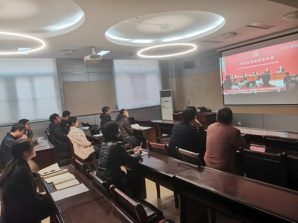 11月12日上午10时,我院组织全院干部师生分别在逸夫科技楼209会议室、401教室集中观看党的十九届六中全会精神新闻发布会直播。