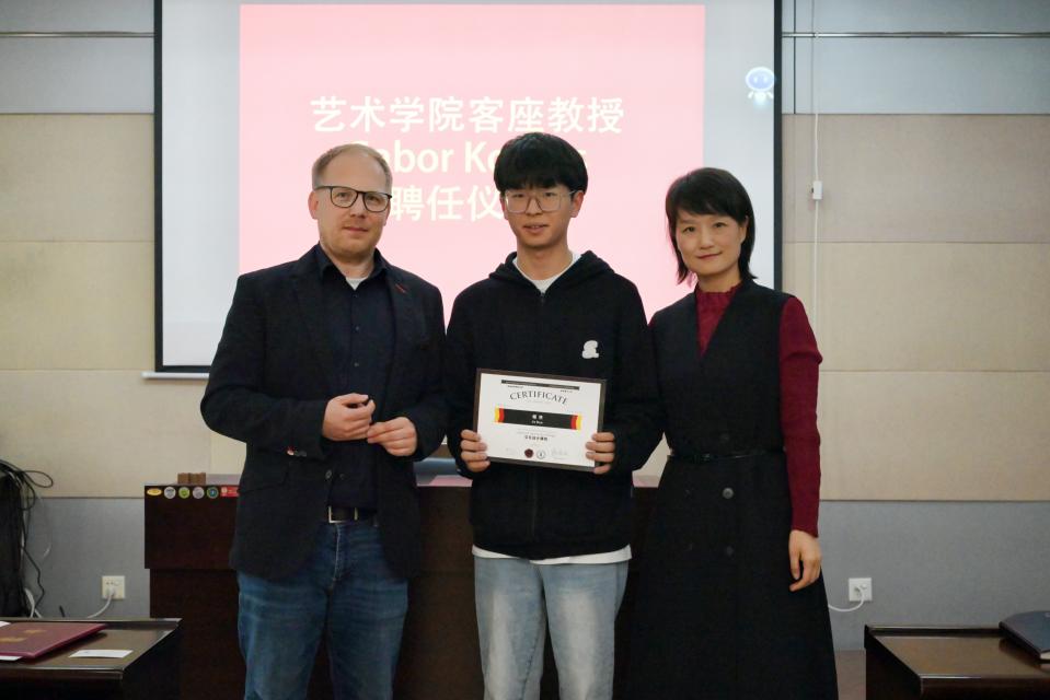Gabor Kovacs教授表示很荣幸能够受任304永利集团客座教授,他认为304永利集团的同学们在之前的多次对外交流项目中表现优秀,他将在两校的合作教学中付出更多,为育人效果的提升做出贡献,他鼓励将在未来一周参加交互设计课程的同学们取得丰硕的设计成果。随后薛艳敏、Gabor Kovacs两位教授为2022年参加“交互设计”共建课程的17名同学颁发了结课证书。