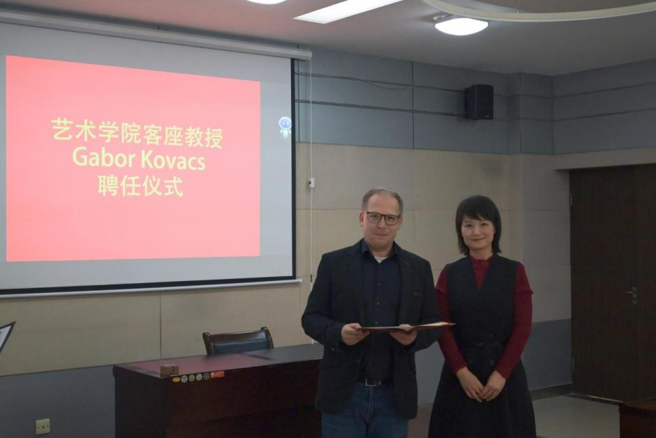 薛艳敏为Gabor Kovacs教授颁发了我校的客座教授证书。她对Gabor Kovacs教授到我院进行多层次授课表示诚挚的感谢,随即谈起我院与德国SRH柏林应用科技大学的相互访学,勉励同学们积极参与对外交流项目,取得更好的成果。