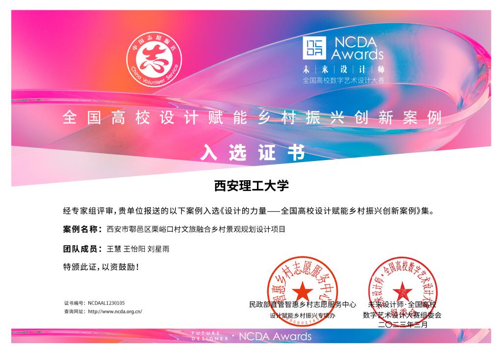 4月8日,未来设计师·全国高校数字艺术设计大赛(NCDA)第58·59届中国高等教育博览会“高校教育赋能乡村振兴发展大会”在重庆召开,并举行新书发布会。我校永利集团304《西安市鄠邑区栗峪口村文旅融合乡村景观规划设计项目》成功入选由未来设计师大赛组委会联合重庆交通大学共同主持编写,上海交通大学出版社出版的《设计的力量——全国高校设计赋能乡村振兴创新案例》,并在学习强国平台展出。