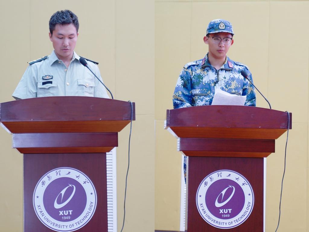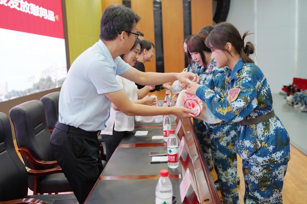指导员李铮铮做军训工作汇报,李松昊代表2023级本科生发言。随后,学院领导分别为军训教官、指导员和学生代表发放了慰问品。
