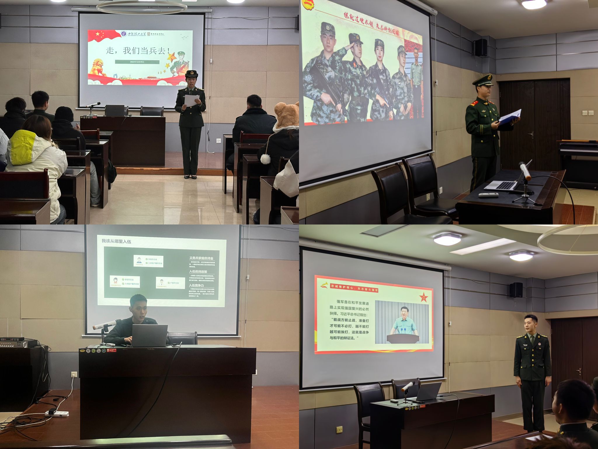 为扎实做好我院征兵宣传工作,帮助学生全面了解大学生入伍条件和优待政策,激发我院学生参军报国热情,12月19日,在艺设楼209开展以“走,我们当兵去”为主题的征兵政策宣讲会。本次宣讲会邀请我院五名退役大学生士兵进行经历分享和政策解读,由辅导员郭旭东主持。