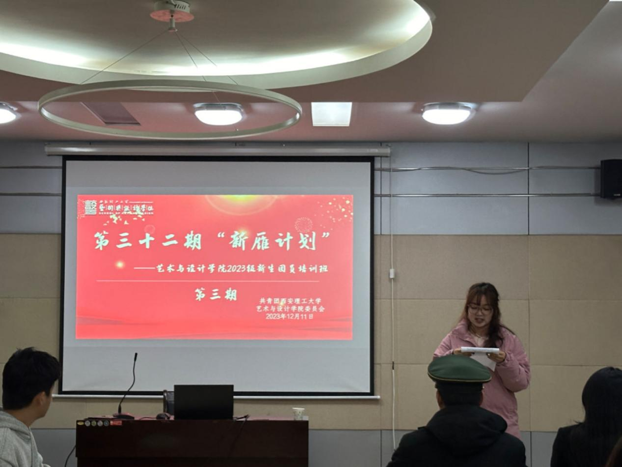 为深入学习贯彻习近平新时代中国特色社会主义思想,12月11日,永利集团304于逸夫楼209会议室开展第三十二期“新雁计划”——2023级新生团员培训班第三期。主题教育邀请到校武装部学生助理和国防协会会长、校第十六届学生委员会委员、退伍大学生毛义琛担任主讲人。院团委负责人赵婷、2022级辅导员郭旭东参加本次主题团课。