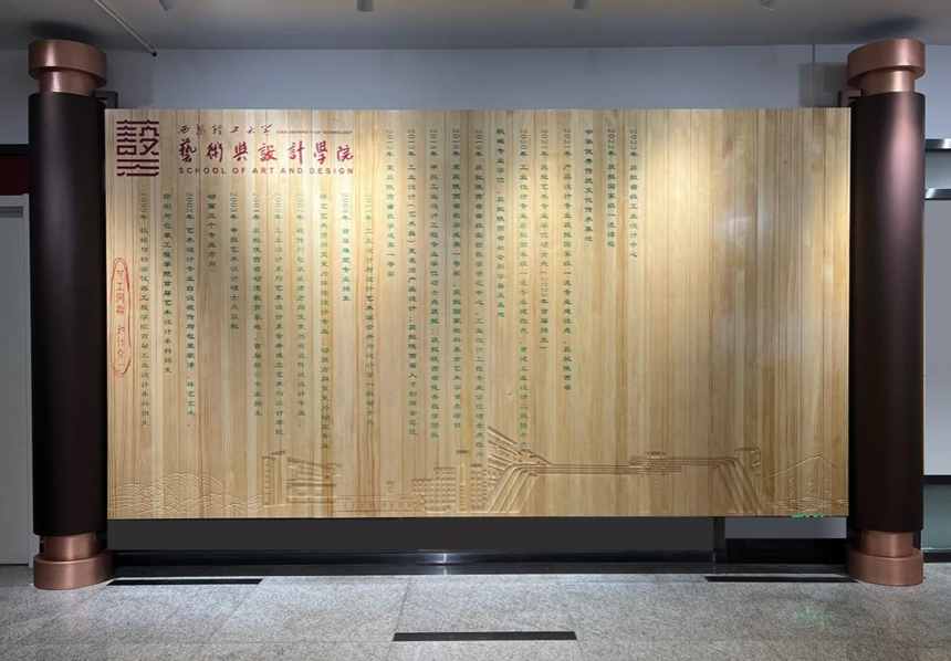 院史卷轴由两边的立柱和中间的竹简组成。立柱稳健庄重,体现学院脚踏实地的发展史;竹简有历史底蕴,凸现学院赓续中华优秀传统文化的浓郁氛围;右侧柱体可缓慢转动,竹简也会逐渐展开,寓意学院蓬勃发展的无限可能;卷轴左侧有用朱文篆刻的“艺工同治,知行合一”的学院办学理念,紧随其后的是学院发展史,为绿色字体,寓意着生机和希望;卷轴下方是敞开的学校大门,展现了学校揽天下英才的风范、育国之栋梁的使命。