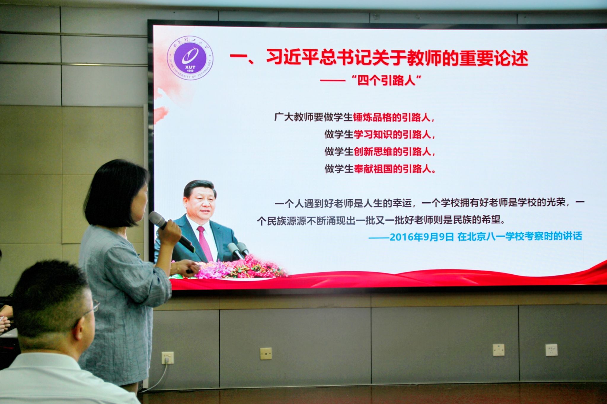 随着一段深情的诗歌朗诵,活动拉开了帷幕,党佳怡与李彤瑶两位同学饱含深情地朗诵,表达了她们对老师们深深的敬意与感激之情。随后,院党委书记李文英代表学院领导向在教育一线上辛勤耕耘的全体教师致以诚挚的节日祝福,并以“守教育初心,担筑梦使命”为题讲授了师德师风专题党课,解读了习近平总书记关于教师的重要论述和上级关于落实教师队伍建设的措施,介绍了学校学院师德师风建设机构与工作机制和师德师风制度体系与活动开展情况。