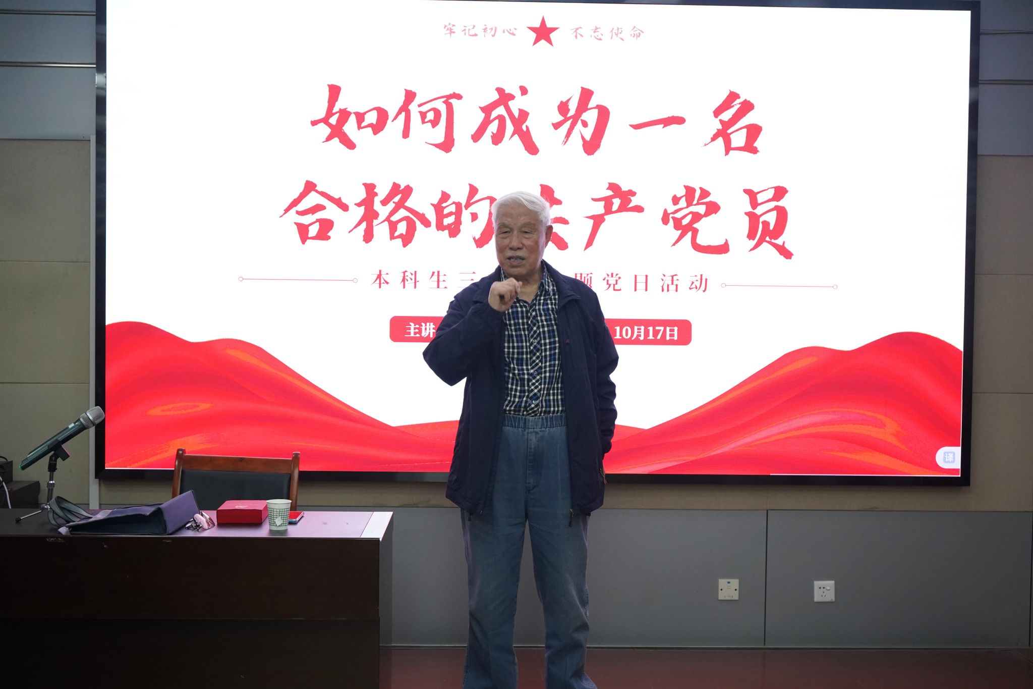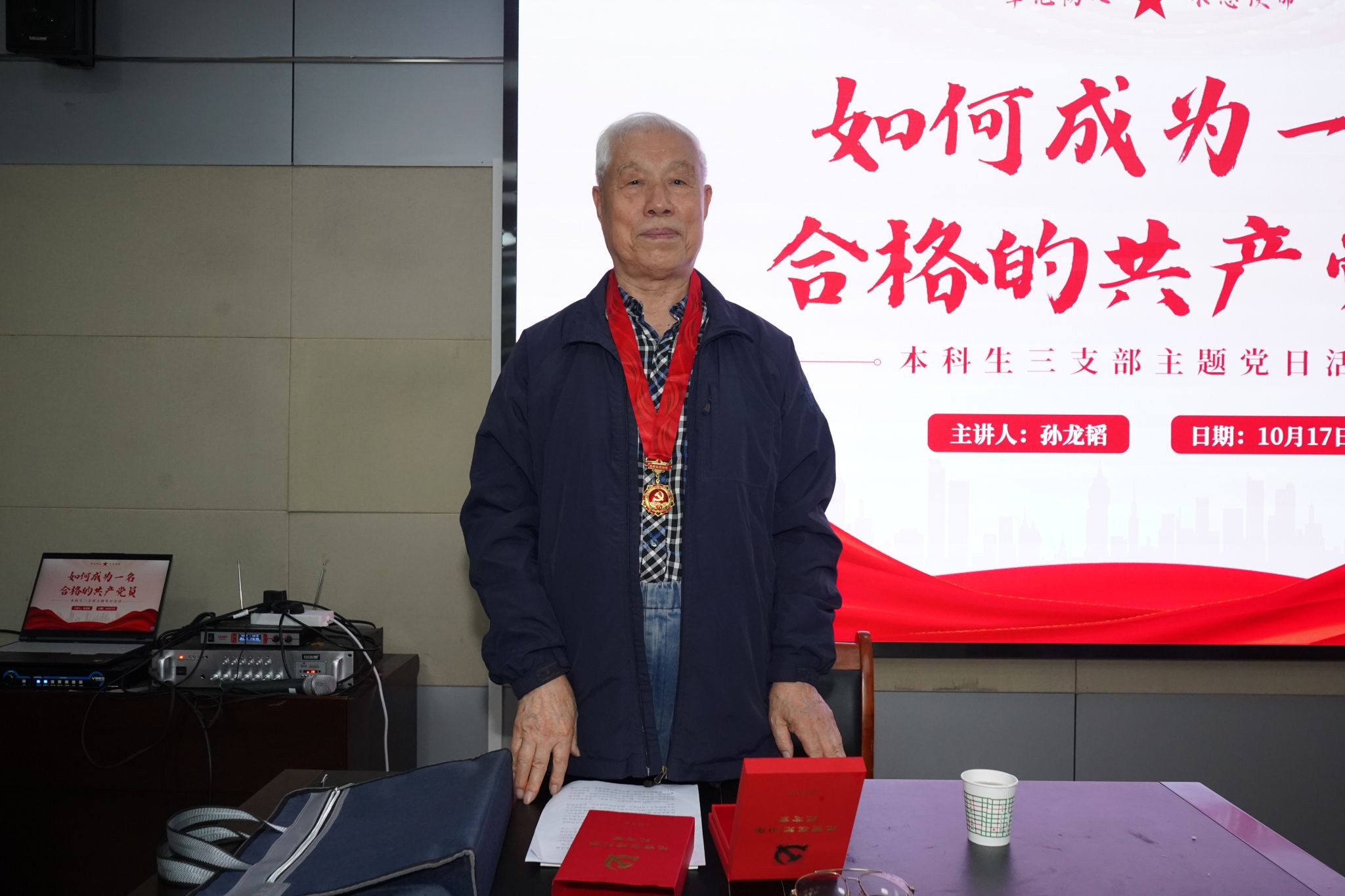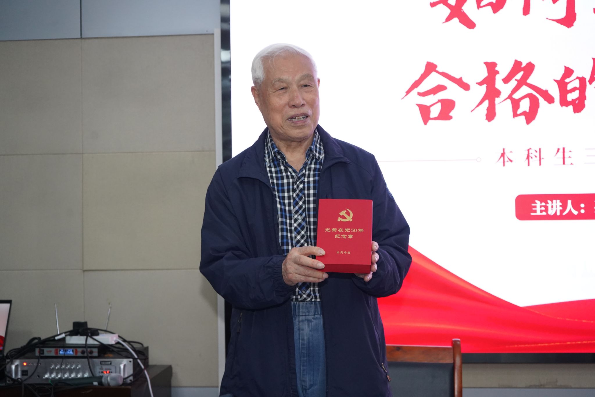 孙龙韬老师以“为什么要加入中国共产党”这一深刻问题作为开场,引发了同学们的深思。随后,他紧紧围绕“怎样才能成为一名合格的共产党员”这一主题,为同学们进行了生动而深刻的讲解。孙龙韬老师为大家展示了校党委在建党百年颁发的“光荣在党50年”纪念勋章,并凭借自己58年的党龄和对党的深厚感情,向同学们推荐了《把一切献给党》《钢铁是怎样炼成的》《论共产党员的修养》三本著作,从共产党员的思想发展、革命者的锤炼过程以及党性修养等多个角度进行了全面阐述。他结合学校校史校情,用鲜活的故事展现了在学校发展建设过程中,先进工作者们如何拼搏进取、勇担使命,为同学们树立了合格共产党员的经典形象。他鼓励同学们在党员发展过程中始终以高标准要求自己,强化责任意识,坚定初心使命。