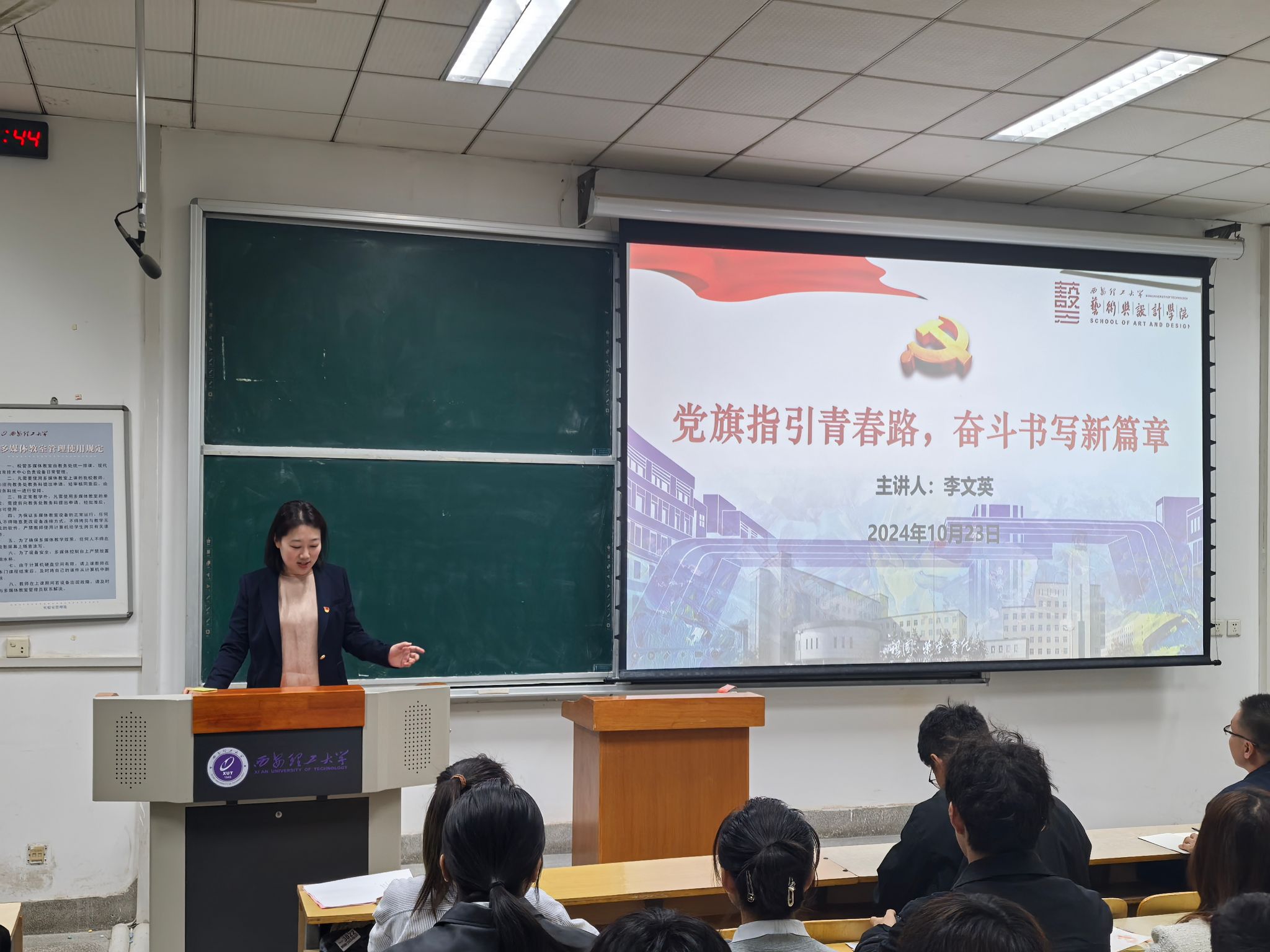 仪式结束后,李文英以党旗指引青春路,奋斗书写新篇章为主题展开了党课第一讲。她从马克思主义,中国共产党,青春奋斗三个方面深入浅出的阐述当代青年要有远大理想,坚定不移跟党走,怀抱梦想又脚踏实地,敢想敢为又善作善成,让奋斗成为青春最绚烂的色彩!
