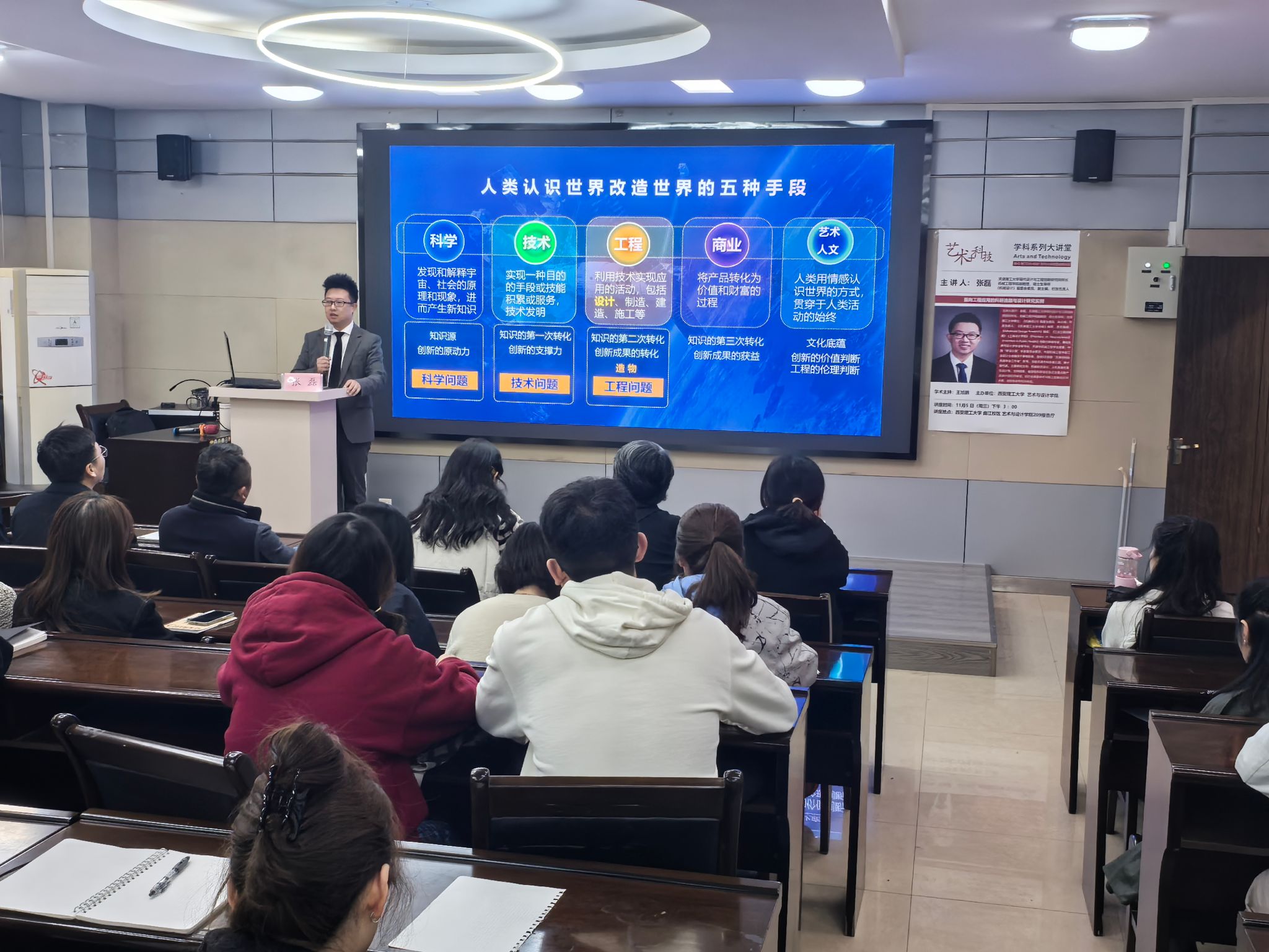 依托其丰富的科研实践与跨学科研究经验,张磊副教授通过多个设计研究与工程应用紧密结合的典型案例,生动阐释了艺术与科技融合在解决实际问题中的方法论与实现路径。在交流环节中,张磊副教授与师生围绕选题创新点识别、研究方法选择以及艺术与工程协同路径等议题展开了深入讨论,并对研究生提出的科研困惑进行了细致解答,现场学术氛围浓厚。