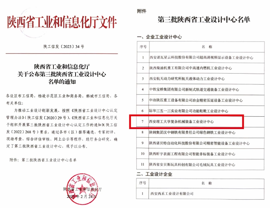近日,陕西省工业与信息化厅发布了《陕西省第三批工业设计中心的通知》,我校申报的“复杂机械装备工业设计中心”获批为陕西省第三批省级工业设计中心。