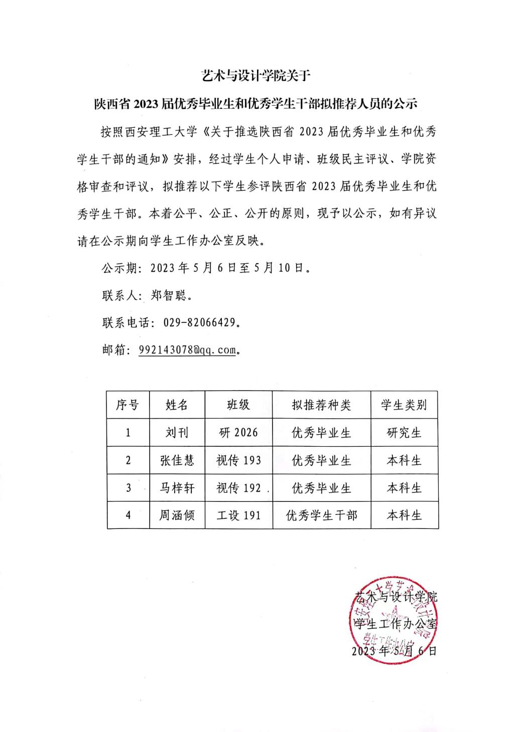 永利集团304关于陕西省2023届优秀毕业生和优秀学生干部拟推荐人员的公示