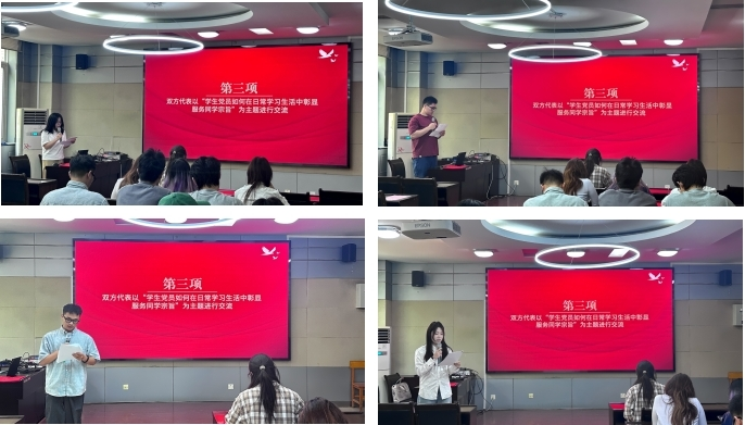 在交流环节,永利集团304研究生二支部的王旭盼、朱文欣以及陕西科技大学设计与艺术学院西部文创党支部的裴思铭、郝秀丽四位学生党员代表围绕“学生党员如何在日常学习生活中彰显服务同学宗旨”主题,从学习互助小组的组建,到校园文化活动的志愿服务,分享了诸多经验与创新思路,展现学生党员为同学服务的热忱与担当。