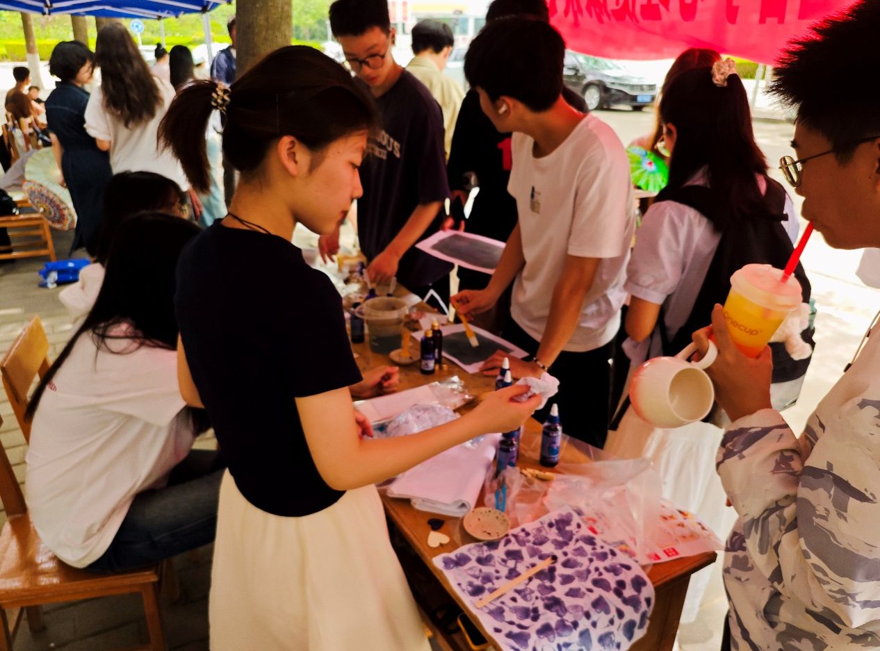活动开始,现场工作人员为同学们详细讲解了扎染和蓝晒的历史渊源、文化内涵以及制作方法。随后,现场同学们迫不及待地动手实践,大家发挥创意,将手中的布料通过不同的折叠、捆绑,赋予其独特的造型,随后浸入染液中,经过一段时间的等待,一幅幅色彩斑斓、图案各异的扎染作品便呈现在眼前。每一块扎染布料都独一无二,正如每个人的内心世界一般丰富多彩。